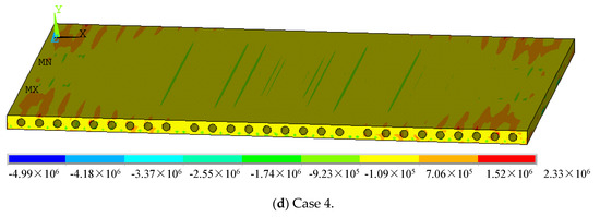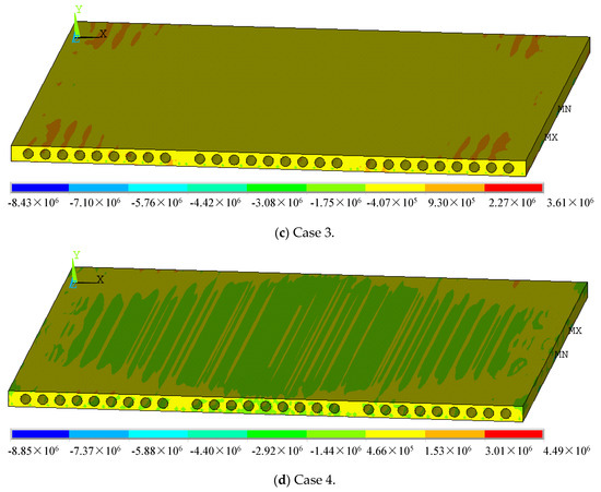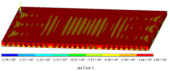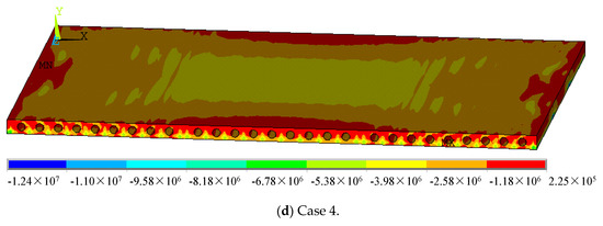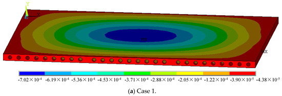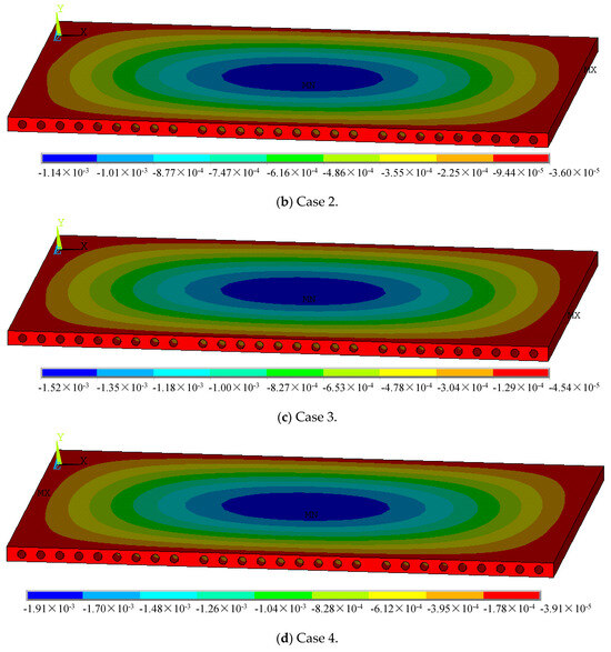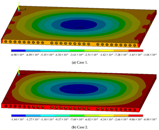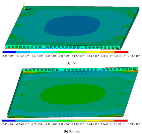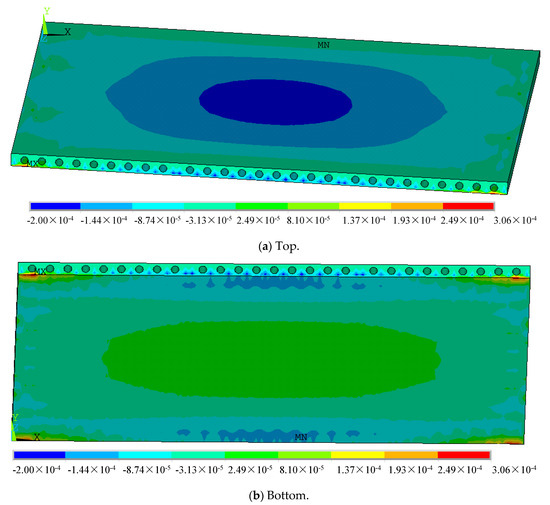 As for concrete, the magnitude of strain directly affects the strength and stability of the structure. Moreover, there is no slip in the reinforcement and concrete, so only the strain in the concrete needs to be analyzed. Figure 19 shows the Z-component of the elastic strain of Case 4 for a 3.3 m × 4.5 m slab. The distribution pattern is similar to vertical displacement, with a local extreme value in the middle of the slab. The top of the slab is under compression with a maximum strain of −200 and the bottom of the slab is under tension with a maximum strain of 306 .
