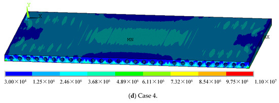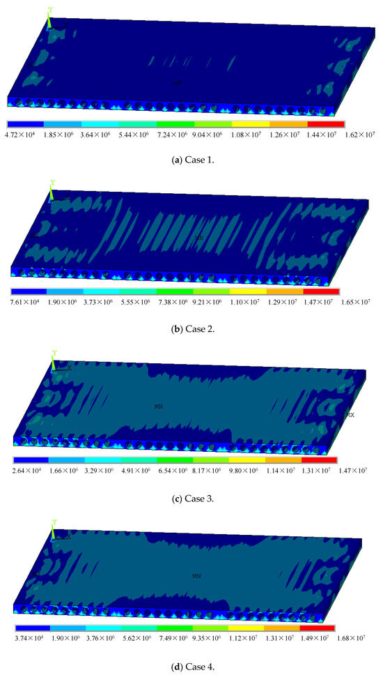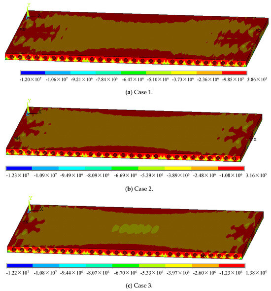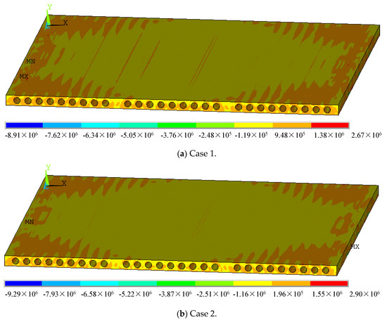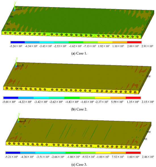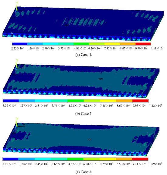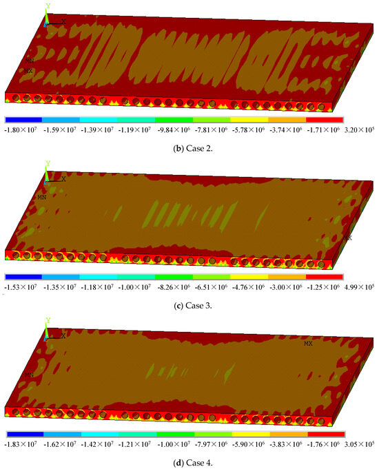 The contours of first principal stress, third principal stress, and von Mises stress for the 4.5 m × 4.5 m slab are shown in Figure 16, Figure 17, and Figure 18, respectively. The three stress distribution patterns of this slab are similar to those of the 3.3 m × 4.5 m slab, and the three stresses are significantly larger than the latter due to the larger span of the slab.