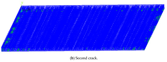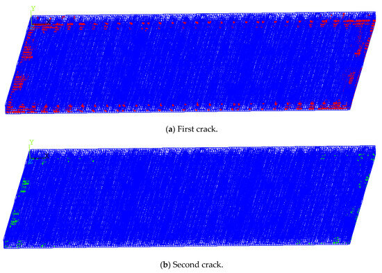 Figure 22 illustrates the cracking process of Case 4 for a 4.5 m × 4.5 m slab. The first concrete crack in this slab occurred in a similar location to the 3.3 m × 4.5 m slab. At the time of the second concrete crack occurrence, the slab had cracks not only at the ends of the prestressing steel strands but also at the ports of the holes close to the sides of the slab.