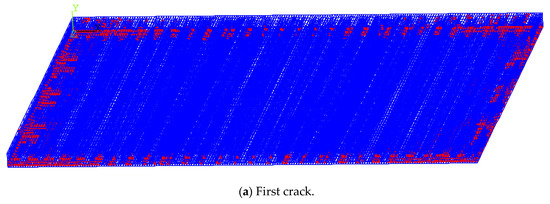 Figure 21 shows the cracking process of Case 4 for a 3.3 m × 4.5 m slab. In stage 1, cracks occurred at the ends of the holes in the hollow-core slab and at the ends of the prestressing steel strands. In stage 2, cracks were concentrated at the ends of the prestressing steel strands. In terms of the cracking process, in the FEM simulation, the slab is subjected to a large pretension force by the prestressing, while the pressure around the slab is small, unlike the rest of the locations where the pretension force can be counteracted by the pressure generated by the loads and self-weight. Therefore, the slab is mainly cracked in tension around the perimeter. A similar phenomenon can be found in another slab.