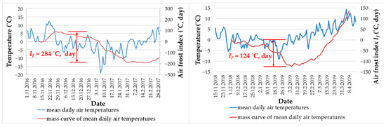- The frost index on the surface of the ballast bed IFS is lower than the air frost index IF due to the thermal-insulating effect of snow cover. In the case of the standard design of the sub-ballast layers (without embedded thermal insulation material), the surface frost index IFS is significantly lower compared to the modified sub-ballast layers (with applied thermal insulation material), which causes greater cooling of the overlying layers);