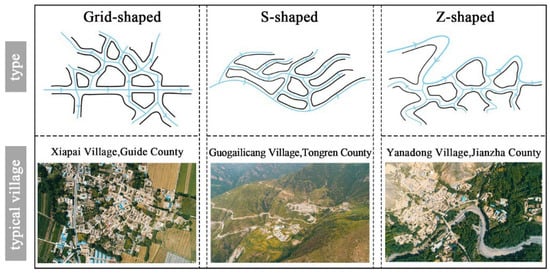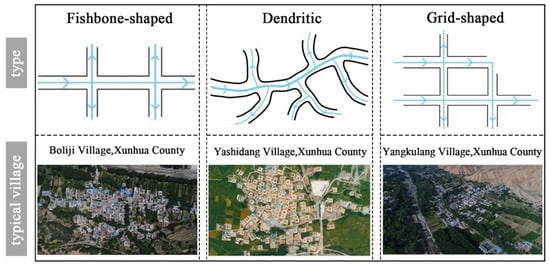 The street and alley layouts of river valley-type villages are predominantly fishbone shaped, dendritic, or grid shaped (Figure 4). Fishbone-shaped streets, exemplified by Boliji Village, are typically found in flat and open areas with gentle slopes. In Boliji Village, the settlement is distributed linearly along Provincial Road 206, with branch roads that closely connect residential courtyards and public spaces, often intersecting the main road at right angles. The dendritic street pattern in Yashidang Village is similar to Boliji Village’s fishbone layout, where a single main street serves as the village’s primary axis and core space. The arrangement of main streets and alleys collectively determines the village’s vertical and horizontal expansion, overall skeletal structure, and spatial morphology. Grid-shaped streets represent an extension of the fishbone layout. For instance, in Yangkulang Village, the main and secondary streets intersect to form a regular network pattern, which enhances the village’s connectivity and orderliness.