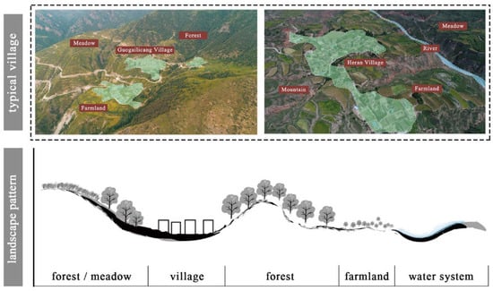 Historically, population growth, religious differentiation, and a large-scale influx of immigrants led to the continuous reclamation of fields in the river valley basins. As the limited resources and environment of these basins became overburdened, people were forced to search for new places to live up in the mountains. During the development of mountain-type traditional villages, the spatial pattern that had formed in the river valley evolved into a “mountain meadow/forest–village–forest–farmland–water system” landscape pattern. This pattern not only preserved traditional agricultural practices but also facilitated the development of animal husbandry, leveraging the terrain and location to create an “agriculture + animal husbandry” economic model. The landscape pattern reflects the integrity, cooperation, and symbiosis of the “ecology–production–life” system (Figure 5).