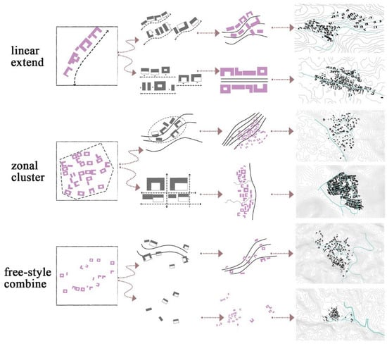 During the construction of villages, residents carefully accounted for the balance between natural elements and their production and living needs, ensuring that the built environment harmoniously integrated with the surrounding natural landscape. The prevalent Zhuangkuo courtyard layout evolved into various configurations, including linear extensions, zonal clusters, and free-style combinations, ultimately forming either strip-shaped, cluster-shaped, or hybrid village boundary forms (Figure 8). In river valley areas, courtyards are typically arranged along rivers, aligning the village layout with the water system’s form. This compact composite arrangement minimizes the use of high-quality arable land while supporting efficient agricultural production and enhancing residents’ daily lives. In contrast, courtyards in mountainous villages follow the contours of the terrain, resulting in a scattered layout with varying heights and larger spacing. This arrangement integrates seamlessly with the surrounding environment, reflecting the adaptability of the village to the rugged terrain.