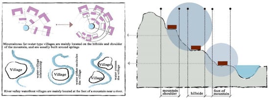 Water availability is a primary consideration in village construction. Villages are typically located on the concave side of water bodies or on hillsides or mountain shoulders above the water system near springs to ensure easy access to water while avoiding gullies (Figure 10). For river valley-type villages, the preferred location is at the foot of a mountain near a river, forming a water–village relationship where the water either encircles or crosses the village. These villages are situated close to fertile arable land, with surface runoff from rainfall and snowmelt on mountaintops serving as the main water source. In contrast, mountain-type villages are located on hillsides or mountain shoulders, often in areas with dense and abundant springs, allowing the village to spread outward in a circular pattern. Additionally, land with favorable soil and moisture conditions in these mountain villages is utilized as arable land or pasture, optimizing land use and fully adapting to the terrain.