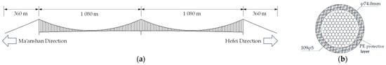 Ma’anshan Yangtze River Bridge and its suspender: (a) General layout of the bridge; (b) Cross-section of the parallel wires; (c) General layout of the suspender of the parallel wires.