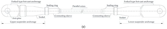 Long-span bridges are subjected to the coupling effect of various loads and environmental erosion in their whole life cycle [,]. The suspension bridge with a cable structure as the main bearing structure has a relatively small total stiffness, and some components are also prone to fatigue damage. As a key force transmission component between the main girder and the main cable, the suspenders are prone to rotation restrictions due to the corrosion of its end-axis pins []. Compared with the length of the anchorage section at the end of the suspension, the length of the parallel wire section of the short suspension is relatively short []. Therefore, the stiffness of the short suspender is obviously larger than that of the long suspender. In the case of limited rotation at the end of the short suspension, the deformation of the suspension is difficult to release through the parallel wire section [,]. Under the cyclic loading of the vehicle, corrosion and fracture are prone to occur between the end anchorage section and the parallel wire section, which directly affects the safety of the suspenders and even the suspension bridge [,].