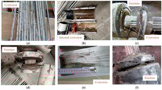 After the first loading stage: when the fatigue cycle reaches 345,000 times, about 14 parallel wires in the outer layer of the suspender are broken, as presented in Figure 8a. The fracture section of the parallel wire is mainly located between the suspender anchorage and the connecting sleeve.
