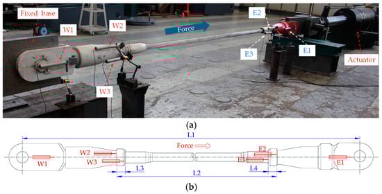 The base and the actuator are adopted and fixed on the floor. The two ends of the tested suspender are fixed on the test equipment with axis pins. Six displacement gauges are arranged at the appropriate position of the suspender to measure the displacement in different regions. The gauges of W1 and E1 are arranged at the position of the axis pin, so the length change in suspender (L1) can be measured; the gauges of W2 and E2 are arranged at the ends of the two sockets, so the length change in the parallel wires (L2) can be measured; the gauges of W2 and W3, and E2 and E3 are, respectively, are arranged at the connection position between the suspender anchorage and the connecting sleeve, so the change in the detached gap between them (L3 and L4) can be measured.