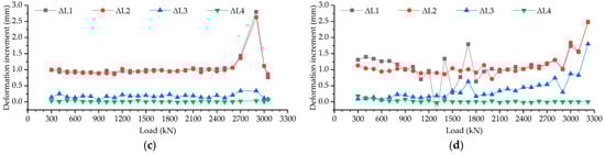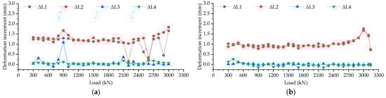 The variation in the displacement measurement results of the adjacent load levels was calculated; as a result, the displacement change relationship of the suspender could be analyzed more intuitively. The deformation increment of each specimen is presented in Figure 4.