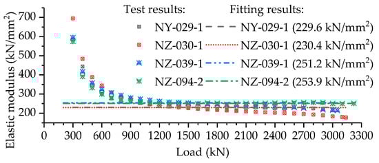 It can be seen from the comparison that the calculated elastic modulus is relatively large at the early stage of loading (loading force < 1000 kN), which is mainly due to the fact that there may still be a certain gap between the parallel wires. When the loading force is in the range of 1000 kN to 2000 kN, the calculation results tend to be stable. When the loading force is larger than 2000 kN, the calculated elastic modulus tends to decrease, which may be caused by the fracture of parallel wires in other regions. Combined with the calculated deformation increments of each specimen, presented in Figure 4, the calculation results of the elastic modulus in the range of 1000 kN to 2000 kN were selected for the fitting. The fitting results of the elastic modulus of specimens NY-029-1, NZ-030-1, NZ-039-1, and NZ-094-2 are 229.6 MPa, 230.4 MPa, 251.2 MPa, and 253.9 MPa, respectively.