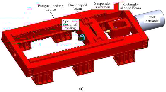 The frame-type loading device was adopted for the fatigue performance loading of the suspender, as shown in Figure 7a,b. For the loading device, the one-shaped beam is the fixed end, and the rectangle-shaped beam is the loading end. The one-shaped beam can be adjusted along with the frame loading device according to the length of the suspender being tested. Both the one-shaped beam and the rectangle-shaped beam are equipped with coaxial circular holes. The suspender specimen can pass through the circular hole. The 250t actuator arranged at the loading end was used for the fatigue loading.