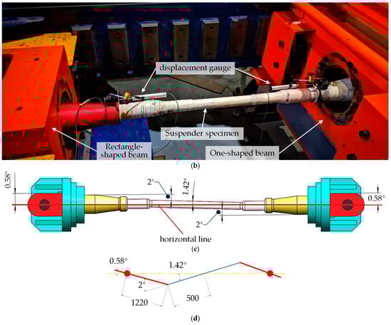Through the specially designed tooling, the suspender can be fixed on the loading device and the deflection angle can be set at the same time. Additionally, the limited rotation of the suspender axis pins in the actual bridge can be simulated. For example, when the angle of the deflection tooling is set to 0.58°, the angle between the axis of the suspender anchorage and the axis of the suspender parallel wire is 2°. At this time, the angle between the axis of the suspender parallel steel wire and the loading axis is 1.42°, as shown in Figure 7c,d.