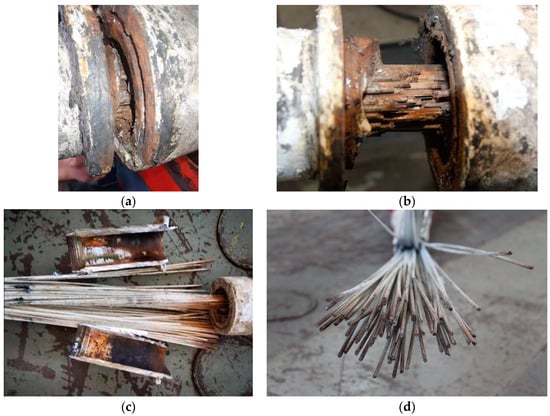 After the rotating restricted short suspenders were unfixed from the Ma’anshan Bridge, corresponding tests were conducted to assess the short suspenders. The short suspenders of NY-29-1, NZ-30-1, NZ-39-1, NZ-94-2, NZ-97-1, and NZ-97-2 were selected to destructively inspect after several kinds of loading test were completed. The typical damage status can be observed as presented in Figure 2.