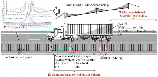 Therefore, the CA simulation model of the random traffic flow can mainly be divided into two parts, as presented in Figure 9. Firstly, the parameters of the overall traffic flow and individual vehicles can realize the simulation of the random traffic flow according to the actual statistical results. Secondly, the influence line can realize the solution of the structural effect. In addition, the cell size will control the calculation accuracy of the whole model.
