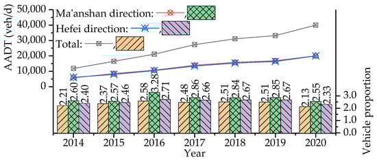 The annual average daily traffic volumes (AADT) in two directions of the target bridge were tested by the WIM system. The tested data were compared, and the proportion of light and heavy vehicles in each direction were also calculated, as depicted in Figure 10.