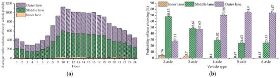 Traffic flow characteristics of different lanes: (a) Daily variation in the average traffic volume of heavy vehicles; (b) Probability of different lanes being selected by various heavy vehicles.