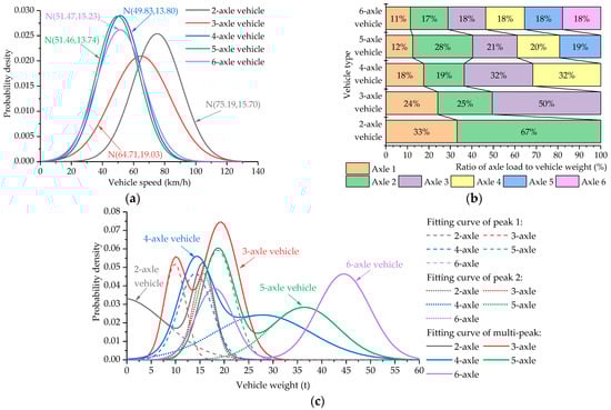 Characteristics of individual vehicles: (a) Normal distribution fitting of the vehicle speed; (b) Ratio of the axle load to the vehicle weight; (c) Multi-peak fitting of the vehicle weight.