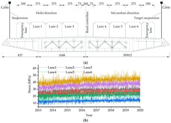 Simulation results based on random traffic theory: (a) Lane distribution; (b) Stress response of the suspenders caused by the vehicles on each lane.