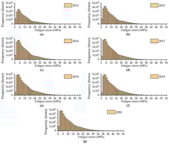 Relationship between the amplitude and the frequency of fatigue stress in each year: (a) 2014; (b) 2015; (c) 2016; (s) 2017; (e) 2018; (f) 2019; (g) 2020.