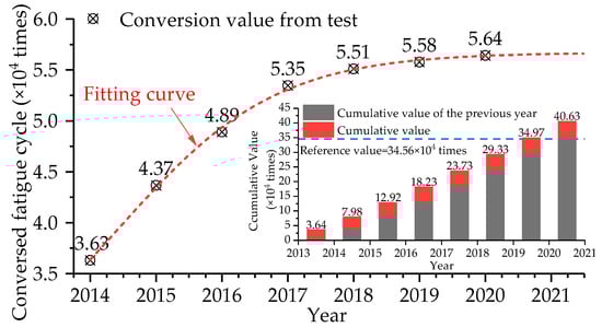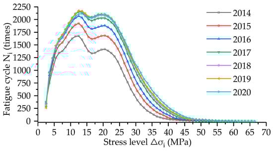 The number of fatigue cycles after conversion can be plotted as a curve, as shown in Figure 16. It can be seen from the converted data that the number of fatigue cycles after conversion showed a significant growth trend between 2014 and 2017, but the growth trend was relatively flat between 2018 and 2020. Its development law is basically similar to the annual change in the total traffic volume of the Ma’anshan Bridge.