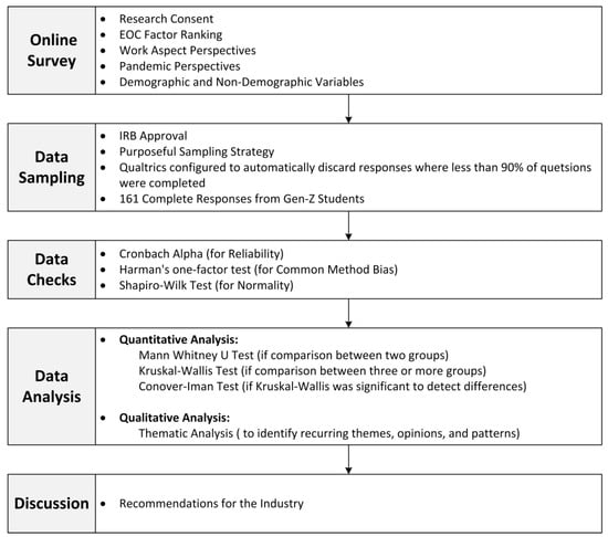 The methodology for this study is summarized in Figure 1. To explore Gen Z’s perspective on their preferences when choosing an employer, an online survey was first developed via Qualtrics. The survey asked respondents to do the following: