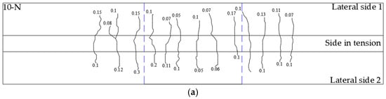 - For a load associated with 60% of the yielding stress (0.6 fy) in the LTR, the maximum flexural crack widths and lengths were greater for beams with an LTR of 10 mm compared to beams with an LTR of 13 mm. This was because the depth of the neutral axis of the beams with an LTR of 10 mm was smaller compared to that of beams with an LTR of 13 mm. The maximum crack widths and lengths were greater nearer to the loading points. This was because in this zone, axial stresses related to flexural and shear forces developed together. Therefore, the tension stresses, due to the combination of axial and shear stresses, were larger than those developed along the center of beams.