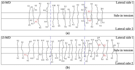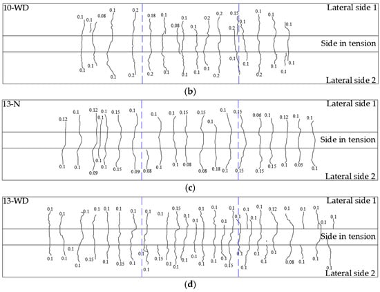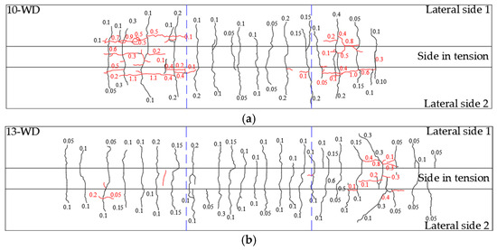- Cracks associated with corrosion were observed parallel to the length of the LTR of beams. The largest corrosion cracks were observed nearer to the loading points. The number of cracks was greater in beam 10-WD compared to beam 13-WD. This was associated with the increment in radial tensile stress associated with the increment in the volume of the corrosion product. This increment was greater for the LTR of beam 10-WD. Corrosion cracks matched with maximum crack widths associated with sustained loads. Corrosion crack widths indicated a significant increment in the radial tensile stresses in concrete due to the increment in the volume of the corrosion product in the LTR.
