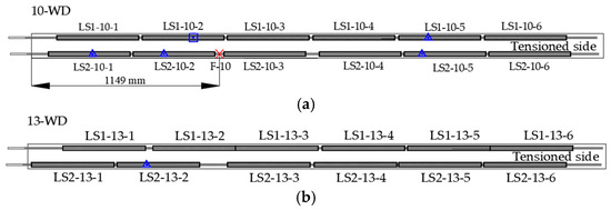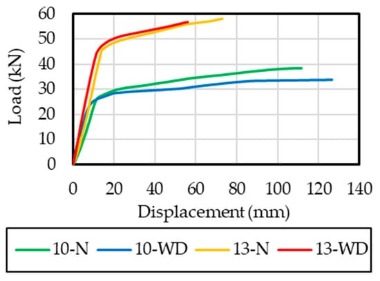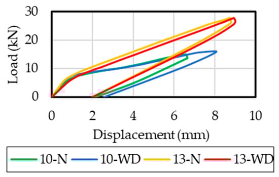 - The yielding load of beam 10-WD was 6% lower than that of beam 10-N. Meanwhile, the yielding load of beam 13-WD was similar compared to that of beam 13-N. The maximum load of beam 10-WD was 12% lower than that of beam 10-N. On the other hand, the maximum load of beam 13-WD was 2.5% lower than that of beam 13-N. The failure of beam 10-WD was associated with the fracture of the LTR. This was because beam 10-WD had a greater cross-sectional area loss of the LTR compared to that of beam 13-WD. A greater influence in the load capacity of beams with a cross-sectional loss was observed for beam 10-WD. This was because in this case, the failure mechanism changed from the crushing of concrete to the fracture of the LTR.