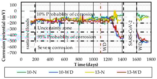- NMX-C-495-ONNCCE; Industria de la Construcción—Durabilidad de Estructuras de Concreto Reforzado—Medición de Potenciales de Corrosión del Acero de Refuerzo sin Revestir—Especificaciones y Método de Ensayo. Organismo Nacional de Normalización y Certificación de la Construcción y Edificación (ONNCCE): Ciudad de México, México, 2015. (In Spanish)