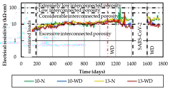 3.2. Electrochemical Parameters and Concrete Resistivity