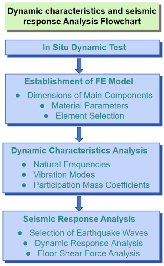 Through in situ dynamic testing and finite element simulation [24,25], the influence of a high stylobate on the dynamic characteristics and seismic response of wooden tower structures is discussed. Figure 3 shows a flowchart of dynamic characteristics and seismic response analysis.