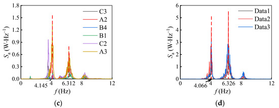 Power spectral density–frequency curves of measuring points. (a) The column top of first floor (east–west), (b) the ground of second floor (east–west), (c) the column top of first floor (north–south), and (d) the ground of third floor (north–south).
