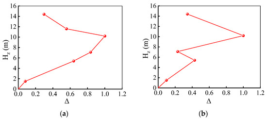 Acceleration responses were integrated to derive displacement responses. The peak-picking method was then used to analyze the amplitude spectrum curve. Displacement amplitudes in the respective directions were extracted at each measurement point corresponding to the resonant frequencies. Subsequently, average displacement amplitudes at the same height were calculated and compared with the maximum displacement response amplitude of the structure to determine the mode shape coefficient of Caiyunjian Tower. Torsional modes were observed in the mode shapes, with north and east being designated as positive directions, leading to spatial ambiguity, as indicated in Figure 9. This finding suggests possible issues with the experimental test point placement or distinguishing linearly related test modes [27].