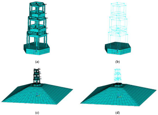 To investigate the influence of the substructure on the upper wooden structures of historic buildings, Zhao et al. [7,8] developed a finite element model of the Drum Tower in Xi’an. A modal analysis indicated that the impact of the stylobate on the dynamic characteristics of the upper wooden structure is significant and should be considered. Xue et al. [9] conducted a numerical analysis on the seismic response of the Yingxian Wooden Pagoda, and the results showed that the high stylobate amplifies the acceleration and displacement of the wooden structure. A 3D finite element model of wood structure–abutment–foundation of Xi’an Bell Tower was established by Meng et al. [10]. The results indicated that the relative displacement of the second floor of the timber structure is increased by 2.12 times and the displacement of tower base relative to the ground is increased by 44%. Their findings revealed that when the natural frequencies of the upper wooden structure align closely with those of the high stylobate, the latter significantly affects the dynamic characteristics of the former. As a famous palace-style timber building with a high stylobate, Guangyue Tower was studied by Sun et al. [11] and Meng et al. [12]. The results indicated that when the soil–structure interaction is considered, the natural frequency of the structure is reduced, and its influence on the high-order natural frequency of the structure is greater than the influence on the low-order natural frequency. Pan et al. [13,14,15] carried out a detailed analysis of the ancient wooden buildings on a slope from the aspects of failure mode, dynamic characteristics, and seismic mechanism. The research shows that the high-slope structure reduces the seismic performance of the upper wooden structures. The above research revealed the impact of the high stylobate on the superstructure should not be overlooked for historical structures [16,17,18]. However, in the existing research, the superstructure is mostly palace-style buildings, and there are few tower buildings.
