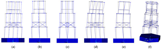The finite element model mode diagram of model 2. (a) The first mode, (b) the second mode, (c) the third mode, (d) the fourth mode, (e) the fifth mode, and (f) the sixth mode.