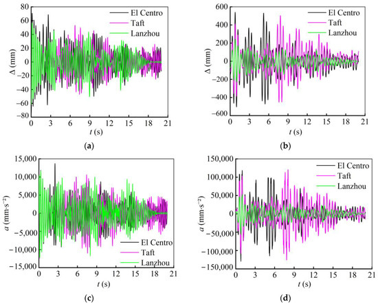 Time history curves of the reference points of the two models under a local seismic excitation at the peak acceleration of 400 cm/s2. (a) Displacement–Time curve of model 1, (b) displacement–time curve of model 2, (c) acceleration–time curve of model 1, and (d) acceleration–time curve of model 2.