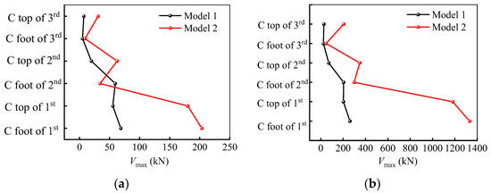 Distribution diagram of floor shear force (C means column). (a) El Centro apeak = 70 cm/s2; (b) Taft apeak = 400 cm/s2.