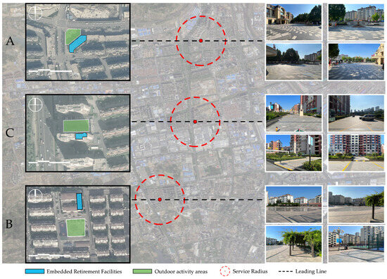 For site selection of ERFs, priority should be given to locations with high sky visibility, open spaces, and distances from urban roads, while avoiding the negative impacts of surrounding tall buildings on older adults’ spatial perceptions. In terms of age-friendly renovations for outdoor activity areas in ERFs, the focus should be on aligning the spatial layout of key elements with older adults’ behavioural characteristics, while also prioritising the quality of green space. This study provides valuable insights for planners and designers, offering guidance on optimising the spatial characteristics of outdoor activity areas for ERFs.