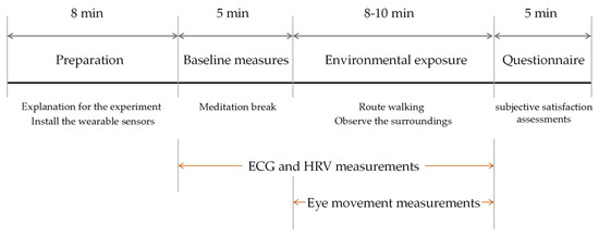 The experiment was conducted over 27–29 June 2024, between 14:30 and 17:30. The weather remained mild throughout the duration, with minimal fluctuations. The average temperature was 24.5 ± 0.4 °C, and the average relative humidity was 86.9 ± 3.1%. Each session lasted approximately 30 min and consisted of four phases: preparation, baseline measurement, environmental exposure, and subjective assessment (Figure 3). Given the duration of each experiment, 10 participants completed it at one area per day to ensure relatively consistent weather conditions. In the preparation phase, the researcher explained the procedures to the participants, who then donned wearable sensors, including wristband physiological sensors and an eye tracker, to monitor EDA, HRV, and eye movement. During the baseline measurement phase, the participants were asked to sit still for five minutes to allow the researchers to record baseline physiological data. In the environmental exposure phase, the participants were escorted to the main entrance of the ERF, where they were instructed to walk along a predetermined path at their preferred moderate pace while observing their surroundings. Two researchers accompanied the participant during this phase: one monitored the participant’s real-time physiological responses, and the other guided the participant’s movement, ensured that no special conditions affected the experiment, and recorded a video of the process. In the final subjective assessment phase, the wearable sensors were removed, and the participants were invited to complete a questionnaire survey regarding their satisfaction with the spatial characteristics.