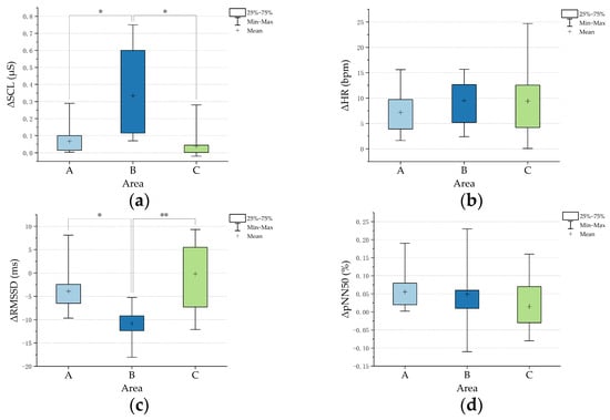 Indicators of older adults’ physiological perceptions of the three outdoor activity areas: (a) ΔSCL; (b) ΔHR; (c) ΔRMSSD; (d) ΔpNN50. * p < 0.05, ** p < 0.01.