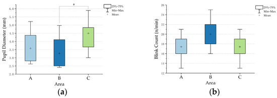 Indicators of older adults’ visual perceptions of the three outdoor activity areas: (a) pupil diameter; (b) blink count. * p < 0.05.