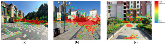 Gaze heatmap of older adults’ visual attention: (a) Area A, (b) Area B, and (c) Area C.
