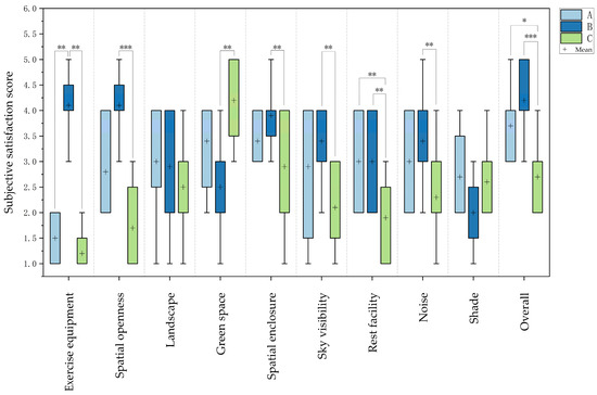 Older adults’ subjective satisfaction with the spatial characteristics of the three areas. * p < 0.05, ** p < 0.01, *** p < 0.001.
