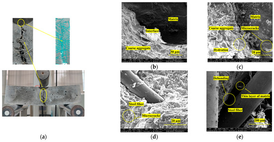 The CT scan was conducted to investigate the microscopic failure mechanism of the specimens and Figure 3a,b show the matrix and coarse aggregate interface in the failed specimen. The microcracks of the concrete and spalling of the cement matrix were observed near the fiber hole grooves in Figure 3c,d, which indicates that the interfacial transition zone of steel fibers and cementitious substrate was the weak area and was more prone to damage. The debonding of steel fiber and the matrix is shown in Figure 3e.