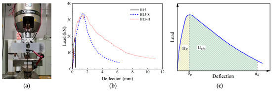 The experimental results are shown in Table 4. The peak values of the flexural stress of the concrete were increased considerably due to the adding of steel fibers. The specimen type of H15-S containing hooked-end fibers provided the largest value of flexural strength, which was 13.74 MPa. Figure 5b shows that the load–deflection curve of H0 broke down shortly after the peak value showing an obvious steep drop tendency, while H15-S and H15-H exhibited a relatively slow drop, which indicated that the type of H0 shows more brittle ductile behavior than the other two types of specimens.
