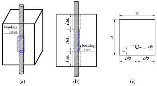 The details of the specimens with reinforcing bars are exhibited in Figure 6. Figure 6a shows the 3-dimensional (3D) schematic diagram of reinforcing bars embedded in the concrete. The middle area is the bonding area between reinforcement and concrete. The bonding area marked as ‘ndb’ means it is related to reinforcing bar diameter. The length of the plastic tube at each end is Lbk. The plastic tube is anchored in the concrete at each end to help guarantee the reinforcement anchorage length. Hence, the height for each specimen equals (2 Lbk + ndb). Other parameters in the test are depicted in Figure 6c. The cover ‘c’ is from the edge of the concrete to the center of the reinforcement. The bar diameter is described as ‘db’. The cross-section dimension for each specimen is 150 mm × 150 mm, which indicates the ‘a’ in Figure 6c is 150 mm. The same dimensional details apply to all specimens in tests. The only two differences are (1) the material properties of concrete; and (2) the embedment length of reinforcing bars.