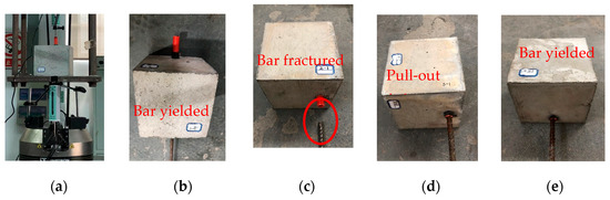 The pull-out tests of the reinforcing bars in concrete were then carried out as shown in Figure 7. The specimens were tested with a monotonic load from the Instron machine, as shown in Figure 7a. Then, the load–slip data points were mapped in a computer. The values for the corresponding load and slip were recorded. When the load–slip response was fully developed, the loading procedure would be stopped. When the test for each specimen was finished, the specimen would be removed from the Instron machine. Meanwhile, the failure mode for each specimen was documented through photography.