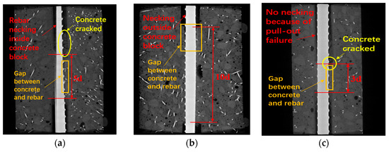 The CT scan work for the concrete blocks was carried out for the SFRC with an embedment length of 5db, 10db, and 3db. The images are shown in Figure 8. The bar was pulled out from the top of the block. For the embedment length of 5db in Figure 8a, the necking of the reinforcement occurred inside the SFRC block. Compared with SFRC-5d, the specimen of SFRC-10d showed no necking inside the concrete block. However, it could be concluded that for the specimen SFRC-10d, the necking of reinforcement occurred outside of the block illustrated by the failure mode shown in Figure 7c. There was no rebar necking for the SFRC-3d neither inside the concrete block nor outside the block by connecting Figure 8c with Figure 7d. The concrete cracked at the top of the bonding area for both SFRC-5d and SFRC-3d, while there was no obvious crack shown for the SFRC-10d. However, there were gaps between concrete and reinforcement for SFRC-5d, SFRC-10d and SFRC-3d. The differences in the gaps are described as follows. There was a clear gap between the concrete and reinforcement for SFRC-5d and SFRC-3d, showing that there was slip between the concrete and reinforcement along the embedment direction. However, the gap between the concrete and reinforcement for SFRC-10d only accounted for 20% of the bonding area, indicating that there was no slip between the reinforcement and concrete other than that of the 20% of the bonding area.
