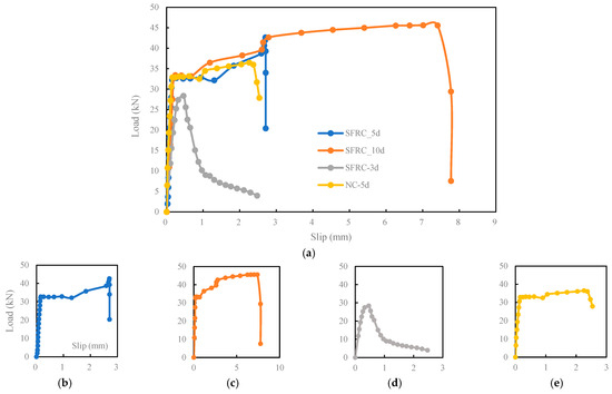 Test results of load–slip responses. (a) Load–slip responses for all groups. (b) Load–slip responses for SFRC-5d. (c) Load–slip responses for SFRC-10d. (d) Load–slip responses for SFRC-3d. (e) Load–slip responses for NC-5d.